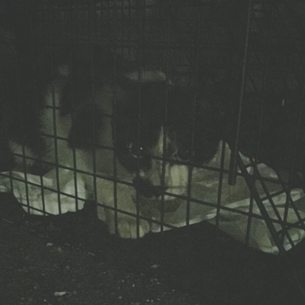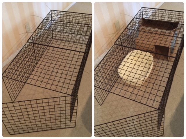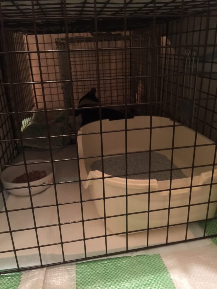 術後のカミュは、Kさん宅1階玄関内に設置した即席ケージ内で療養。